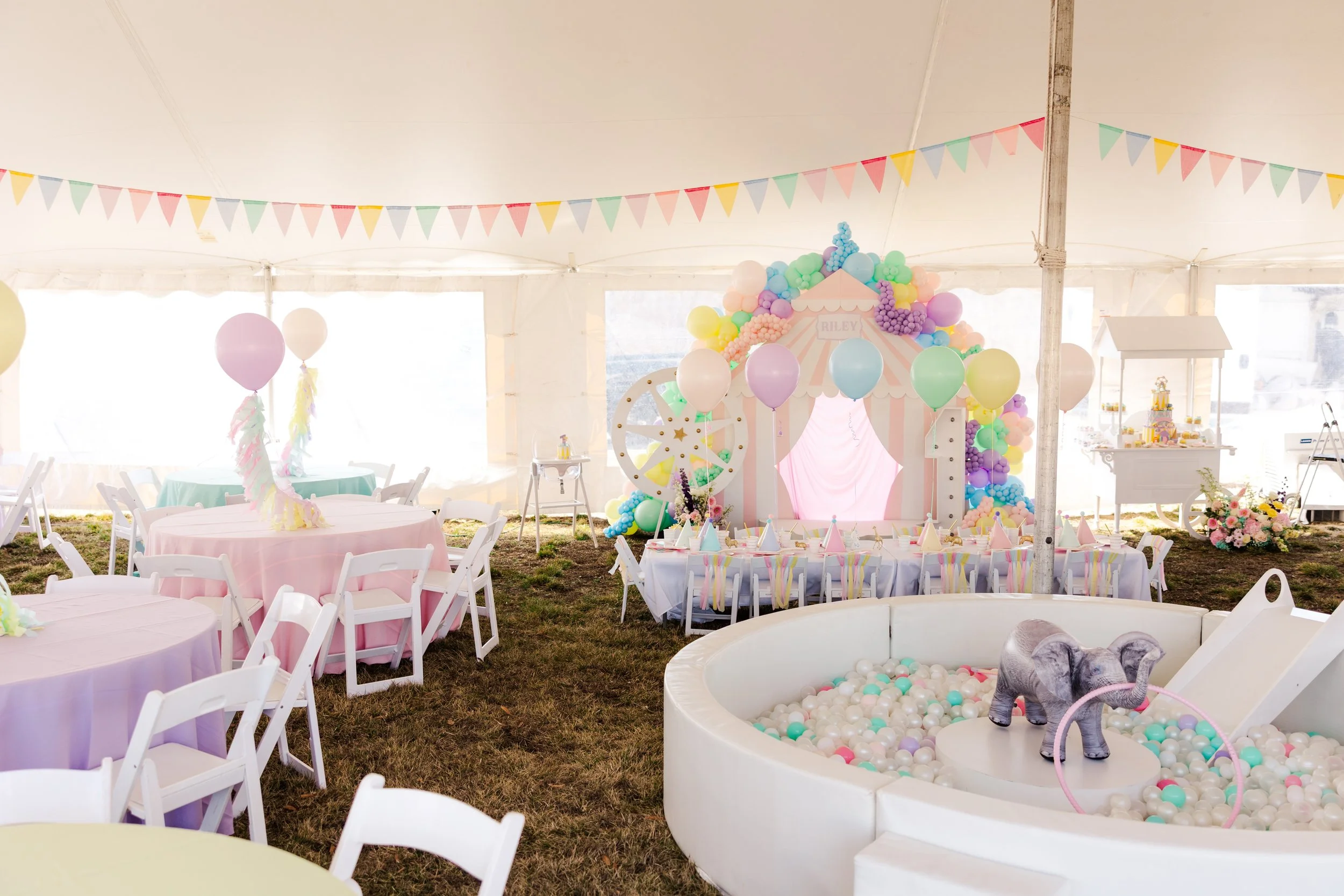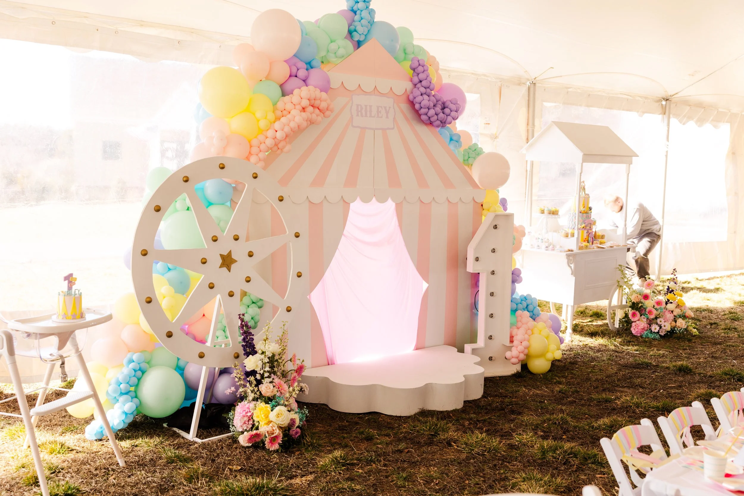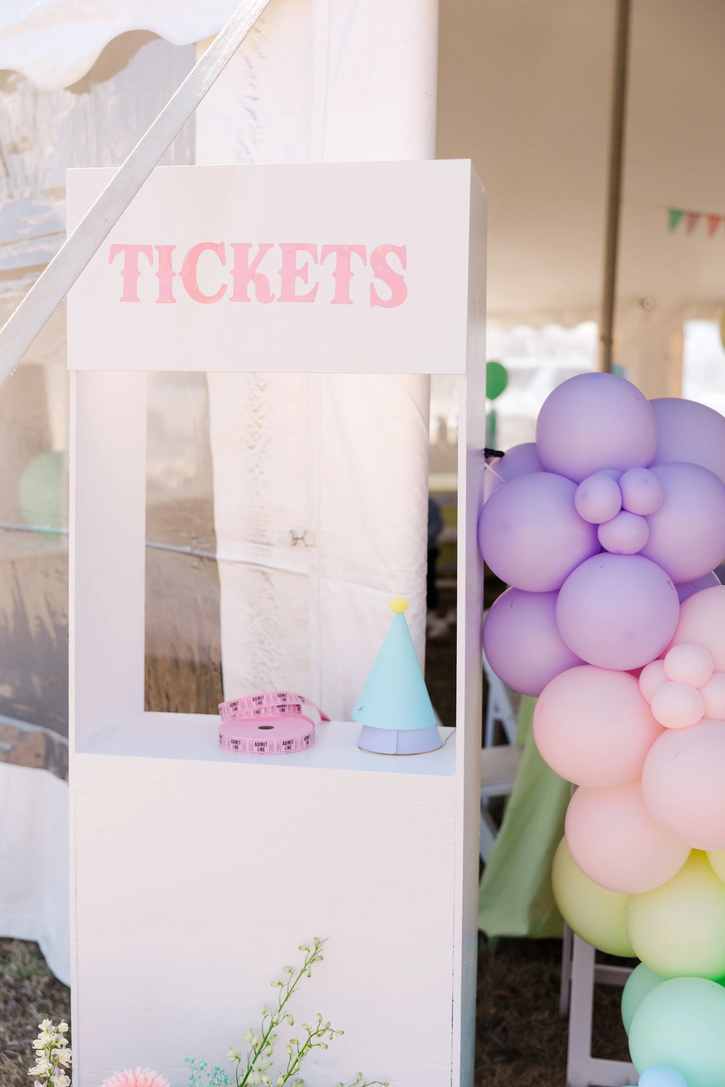 Riley’s Admit One birthday celebration was a dreamy, storybook experience set beneath a tent and designed to feel like stepping into a whimsical world of wonder. Soft pastels, playful patterns, and charming carnival inspired details created an inviting atmosphere where little guests could explore, play, and celebrate in style.