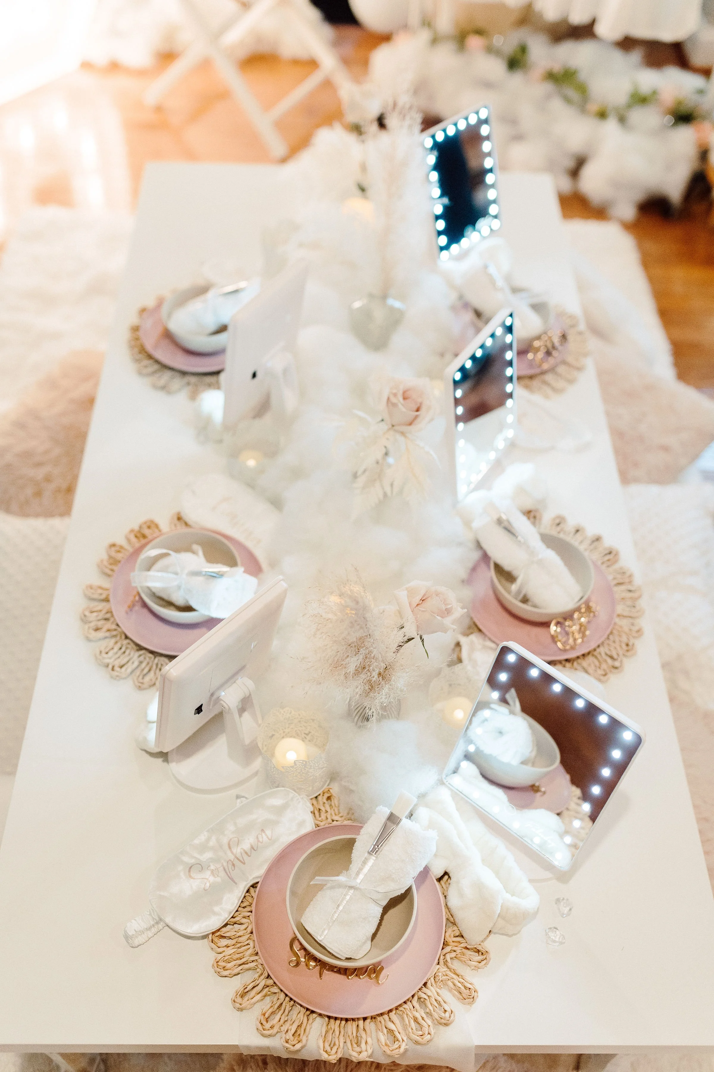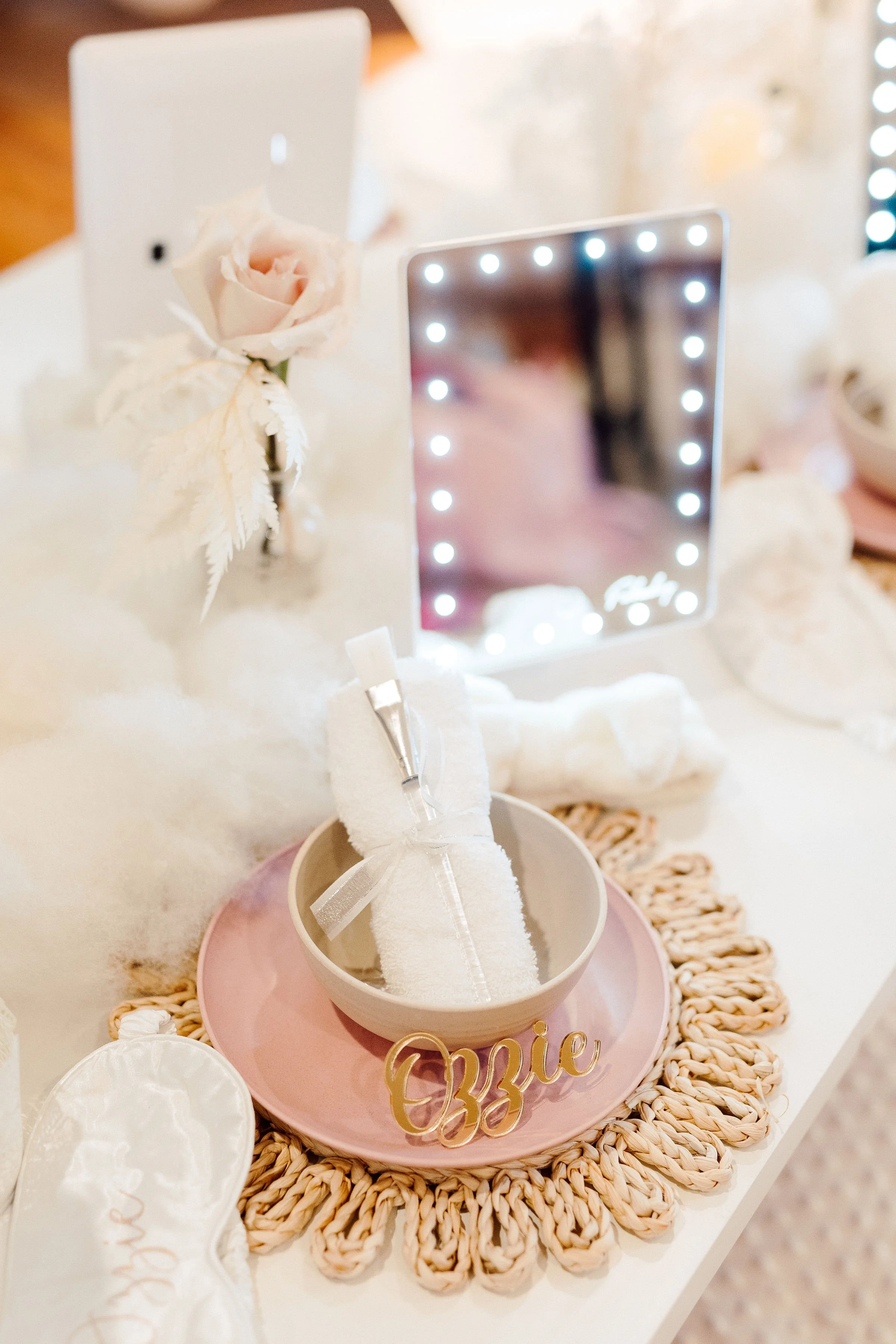 Guests enjoyed a full spa experience with mini facials, cucumber eye moments, beauty stations, plush seating, and personalized details that made everyone feel pampered. Finished with sweet treats and cozy touches throughout, this cloud nine celebration was all about slowing down, feeling special, and celebrating Sophia in the most serene and stylish way.